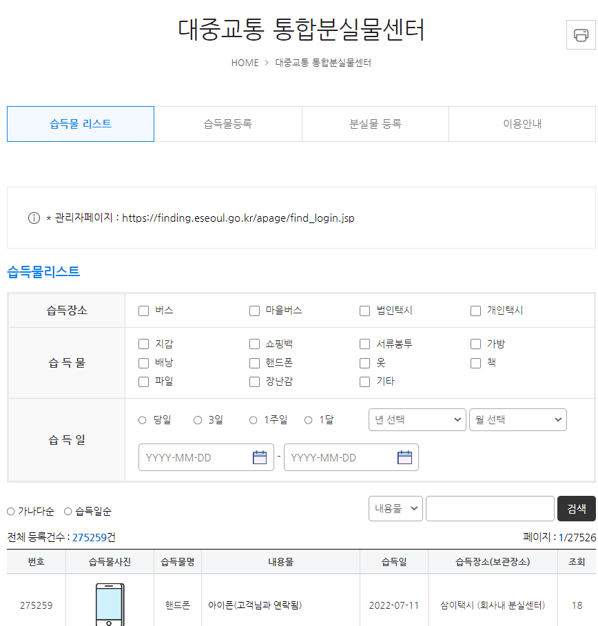 대중교통 통합분실물센터 | 서울특별시