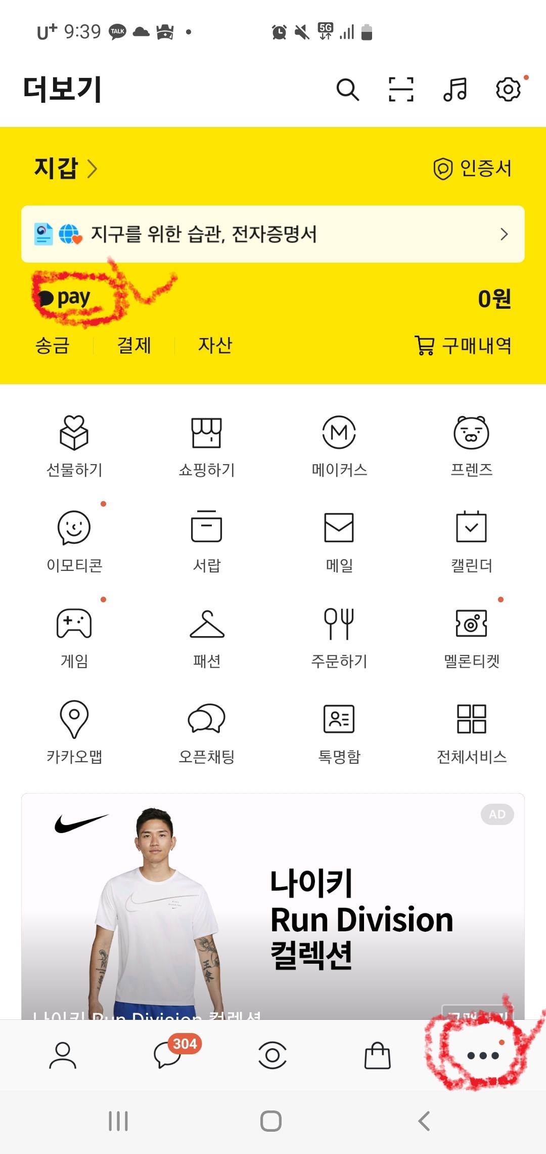 1. 카카오톡-더보기-pay를 클릭합니다.
